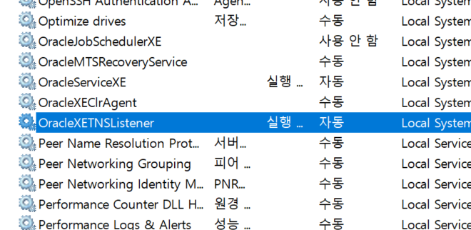 아니나 다를까 OracleXETNSLisner가 작동되지 않고 있었다. 마우스 우클릭을 하여 실행시키니
